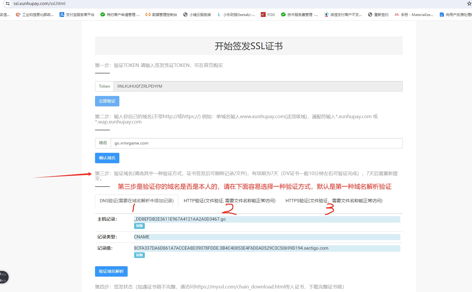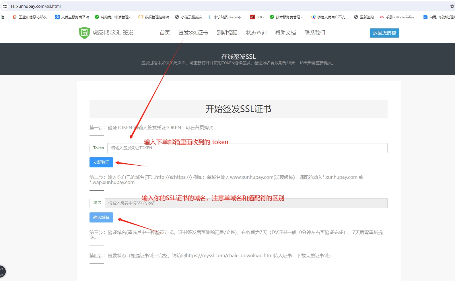 1)验证token,进入证书签发页面:https://ssl.xunhupay.com/ssl.html 输入购买的token,如果token没使用过就验证完成。
